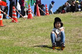 標高404mの基山は、山頂から駐車場まで斜面が広がり、天然芝の草スキーを楽しむことができます。